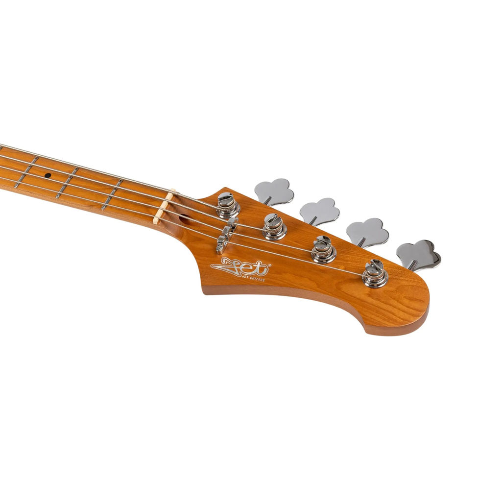 El bajo JET JJB-300 Black destaca por su combinación de maderas tostadas y estética clásica, ofreciendo una construcción sólida con gran respuesta tonal. El cuerpo de álamo tostado y el mástil de arce canadiense tostado con diapasón de palisandro aportan calidez, ataque y estabilidad estructural.
